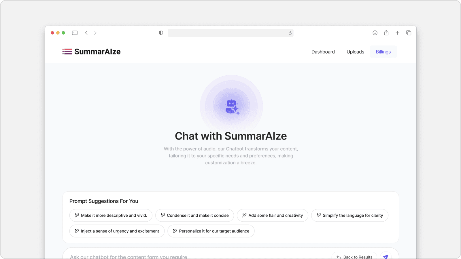 SummarAIze, an AI-powered platform that transforms audio and video content into engaging, shareable formats like summaries, quotes, and social media posts.