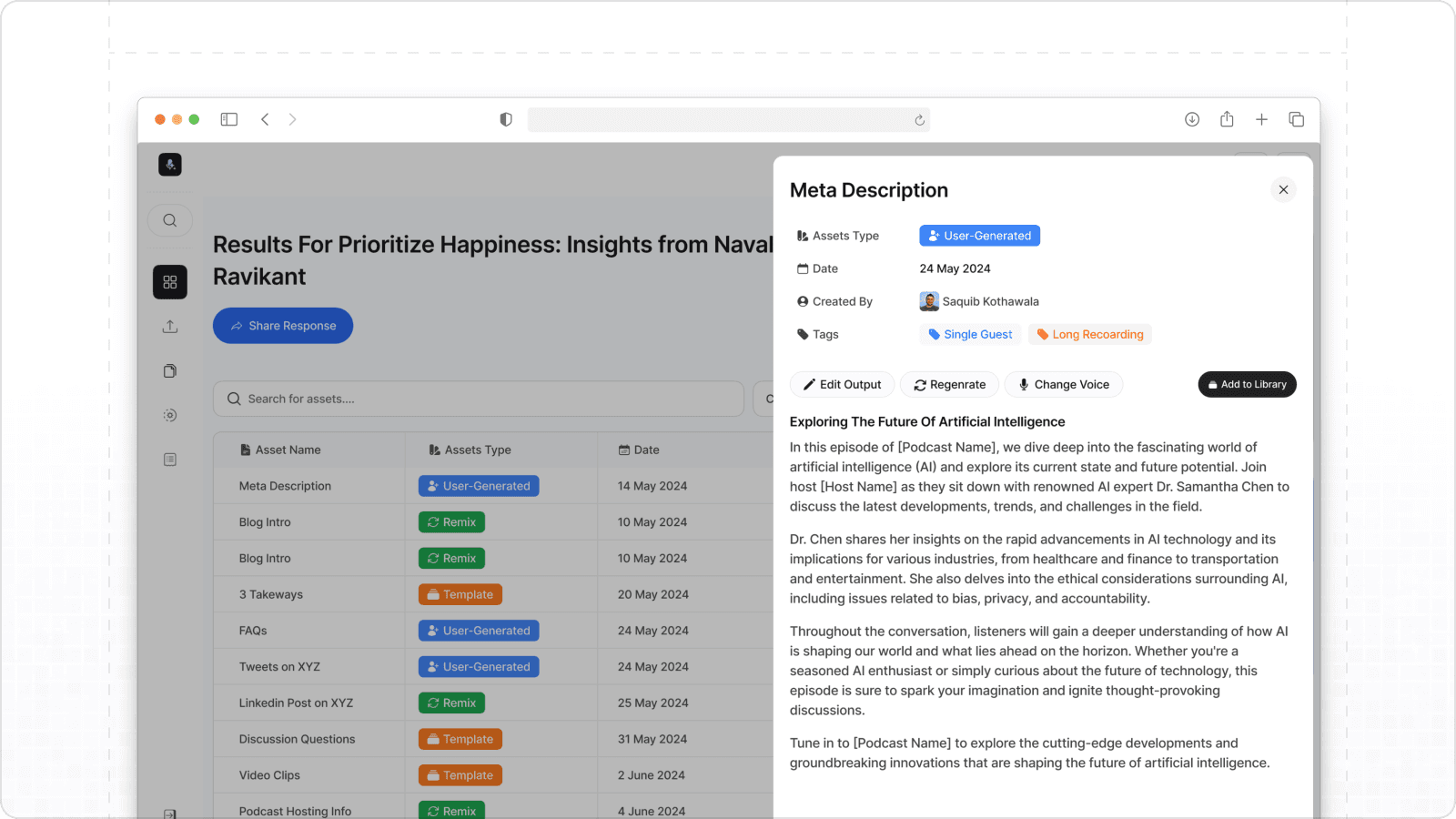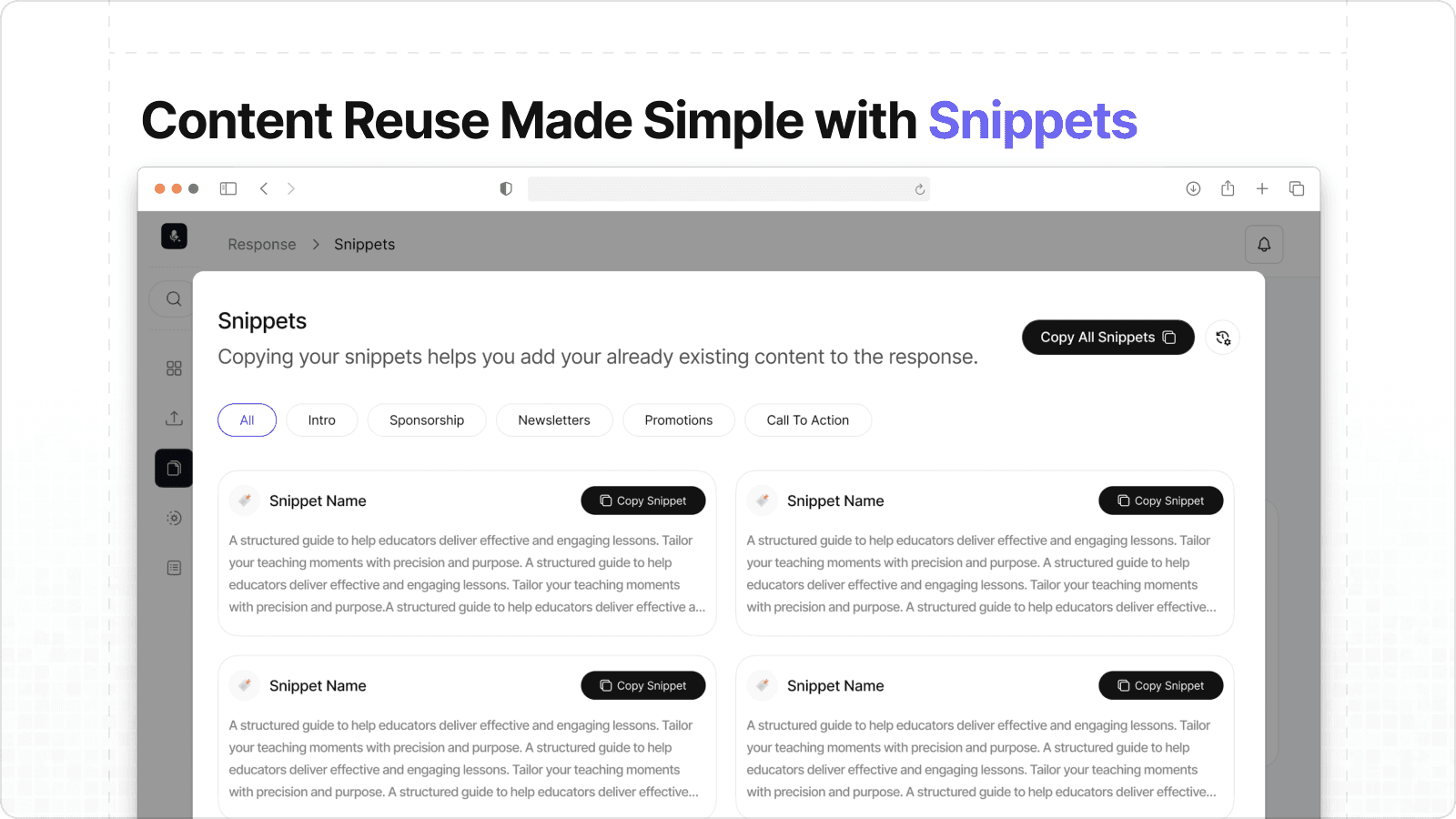 Quickly add pre-existing content to your AI responses with the Snippets feature, streamlining workflows and ensuring consistency in outputs.