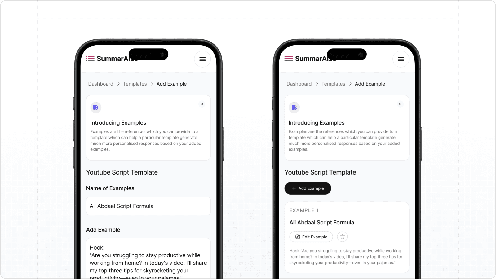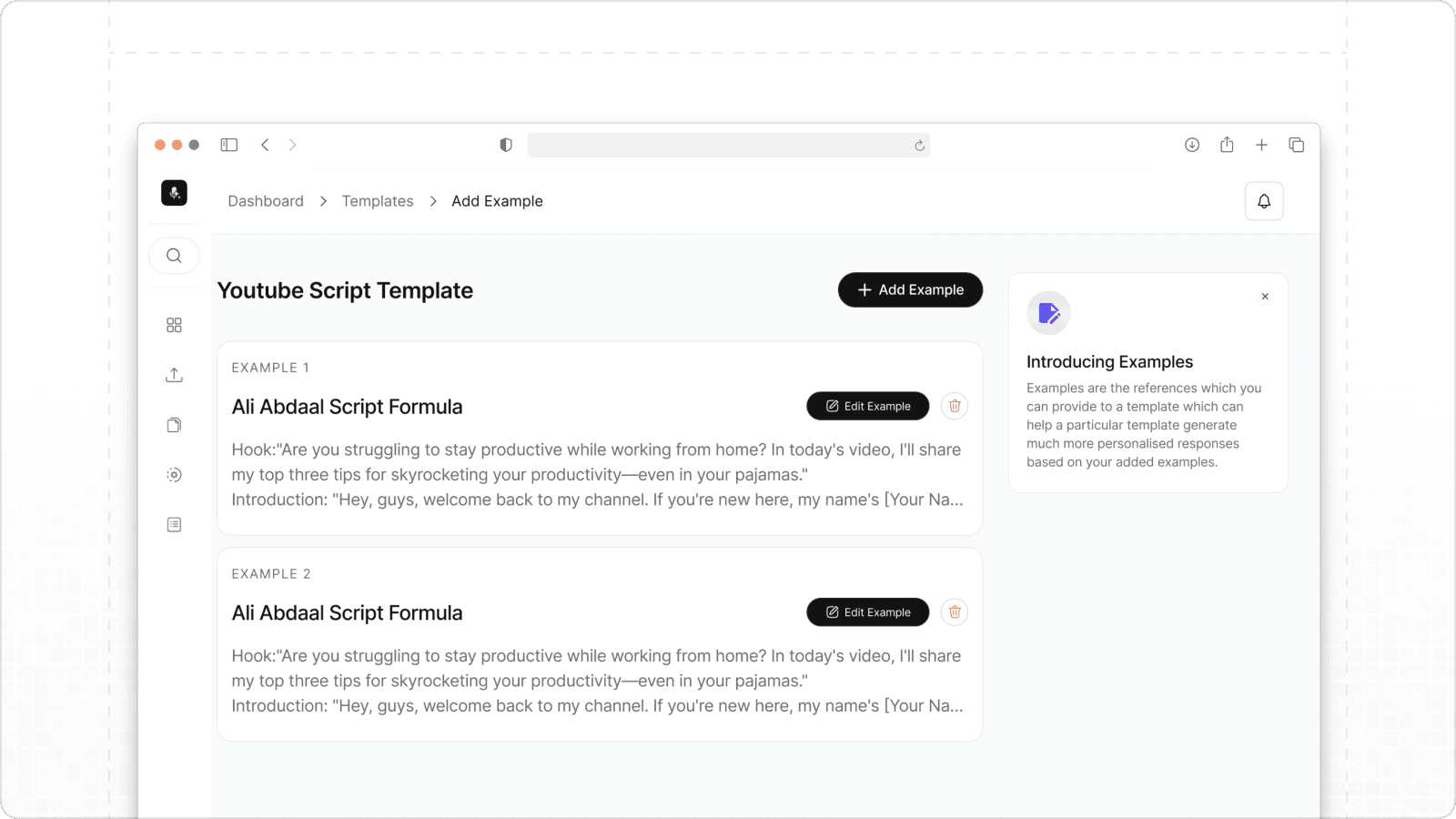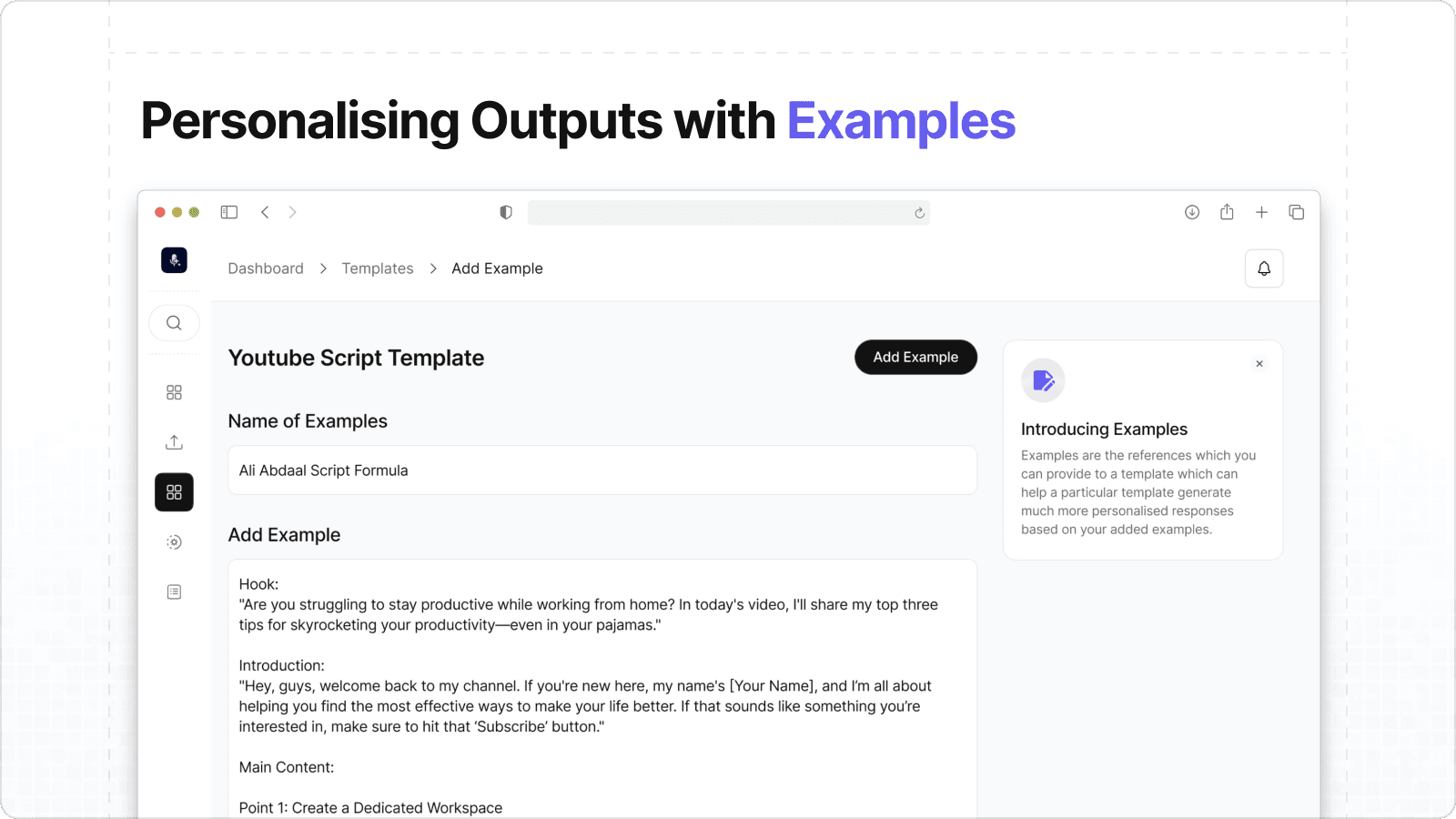 A feature allowing users to add reference examples to templates, enabling the generation of highly tailored and context-rich AI responses.