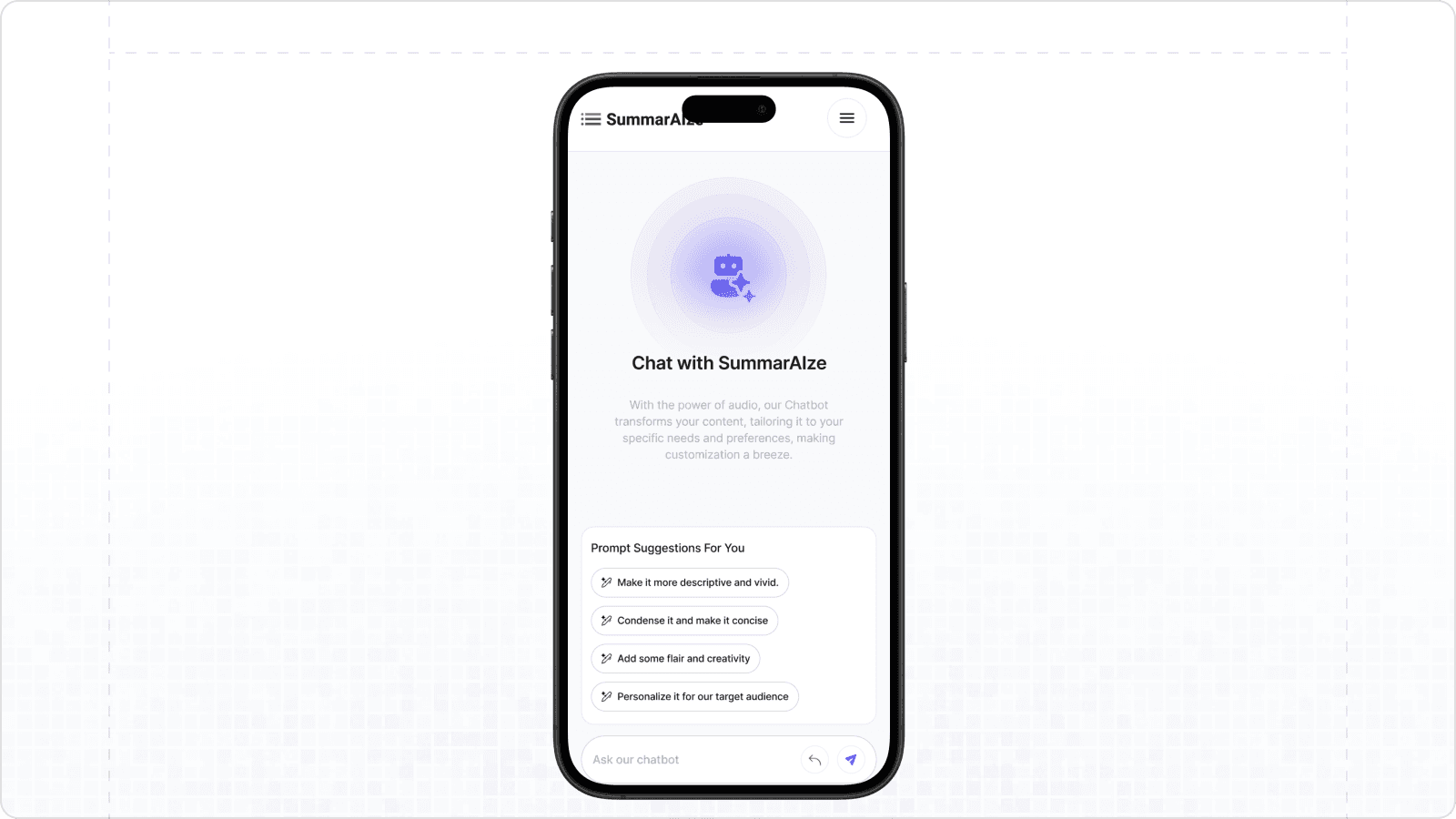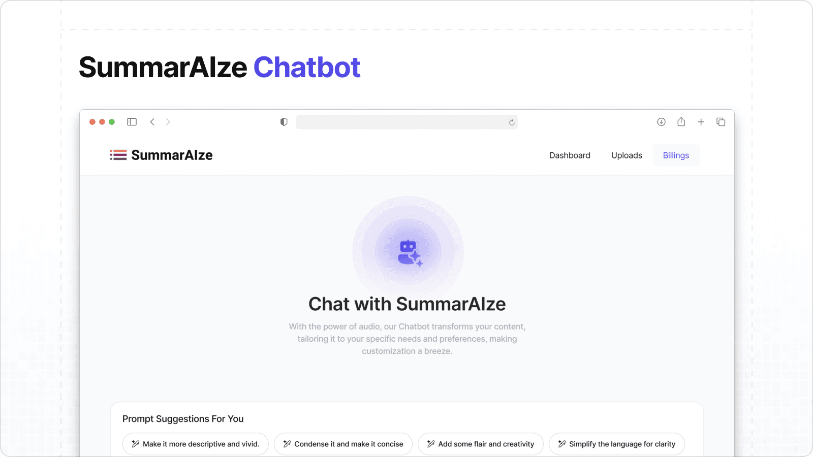 A dedicated page for engaging with the SummarAIze chatbot, providing an intuitive interface to access AI features, manage conversations, and boost productivity.