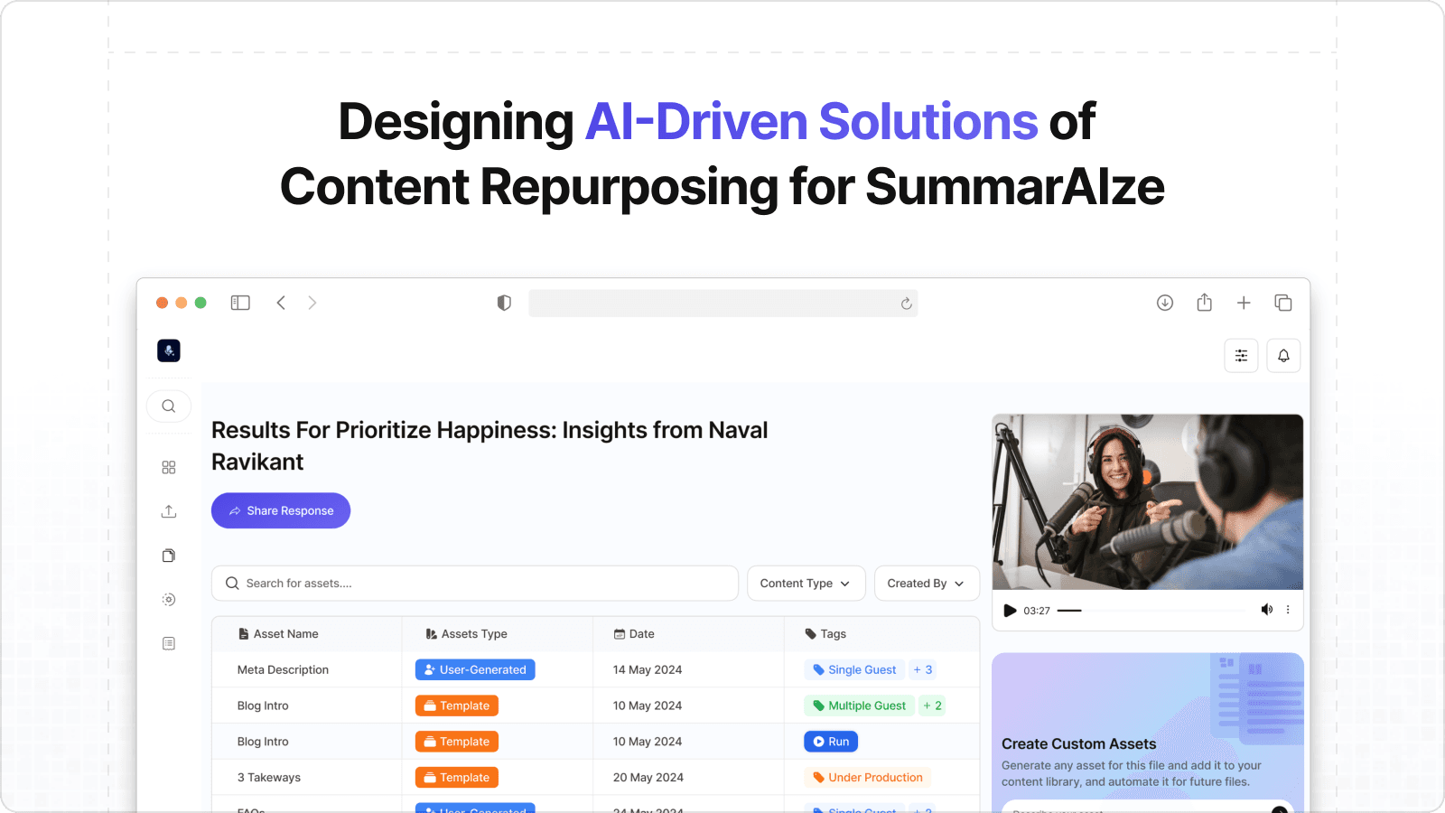 As a freelance product designer, I had the opportunity to collaborate with SummarAIze, an AI-powered platform that transforms audio and video content into engaging, shareable formats like summaries, quotes, and social media posts. This case study highlights the features and interfaces I designed during the project, showcasing how each element was crafted to enhance user experience, streamline workflows, and bring SummarAIze’s vision of intelligent content repurposing to life. Each feature is accompanied by a brief explanation, providing insights into the design rationale and functionality.